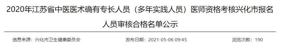 2020年江蘇省中醫(yī)醫(yī)術(shù)確有專長人員醫(yī)師資格考核興化市報(bào)名工作經(jīng)過網(wǎng)上報(bào)名、現(xiàn)場確認(rèn)、縣級市初審,按照《2020年江蘇省中醫(yī)醫(yī)術(shù)確有專長人員醫(yī)師資格考核報(bào)名指南》、《中醫(yī)醫(yī)術(shù)確有專長人員醫(yī)師資格考核報(bào)名審核要點(diǎn)》,現(xiàn)將合格人員名單公示如下,如有異議,請于7天之內(nèi)實(shí)名聯(lián)系興化市衛(wèi)健委醫(yī)政(中醫(yī))科,聯(lián)系電話:0523-83316571