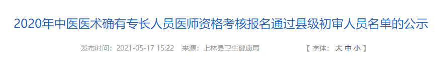 南寧市上林縣發(fā)布了2020年中醫(yī)醫(yī)術(shù)確有專長人員醫(yī)師資格考核報名人員名單,醫(yī)學(xué)教育網(wǎng)小編搜集整理如下:
