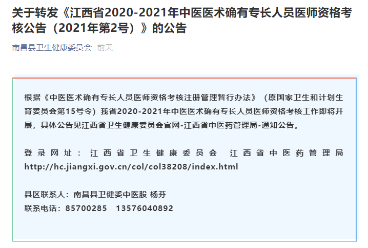 南昌轉(zhuǎn)發(fā)《江西省2020-2021年中醫(yī)醫(yī)術(shù)確有專長人員醫(yī)師資格考核公告(2021年第2號)》,東湖區(qū)/西湖區(qū)/青云譜區(qū)/灣里區(qū)/青山湖區(qū)/南昌縣/新建區(qū)/安義縣/進(jìn)賢縣的考生請登錄江西中醫(yī)醫(yī)術(shù)確有專長人員醫(yī)師資格考核報名系統(tǒng)進(jìn)行網(wǎng)上報名,報名時間:2021年7月30日—2021年8月15日,通知內(nèi)容醫(yī)學(xué)教育網(wǎng)小編整理如下: