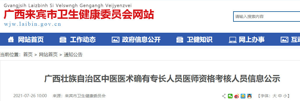 根據(jù)廣西壯族自治區(qū)中醫(yī)藥管理局辦公室《關(guān)于開展2020年廣西壯族自治區(qū)中醫(yī)醫(yī)術(shù)確有專長人員醫(yī)師資格考核報名工作的通知》(桂中醫(yī)藥辦發(fā)[2020]45號)文件要求,我委對趙進周、全桂蓮等33名同志申請參加廣西壯族自治區(qū)中醫(yī)醫(yī)術(shù)確有專長人員醫(yī)師資格考核情況進行復審,現(xiàn)將復審合格人員、指導老師、推薦醫(yī)師相關(guān)信息向社會予以公示,公示期限為5天(自2021年7月26日到7月30日止),如有異議,請在7月30日前通過電話(0772-6622293)、郵箱(YL123899@163.com)、信函向來賓市衛(wèi)生健康委員會反映情況,來信請署真實姓名和聯(lián)系電話,以便于了解核實情況。來賓市衛(wèi)生健康委員會地址:來賓市興賓區(qū)盤古大道121號自然資源局四樓,郵編:546100,聯(lián)系人:廖作梁。