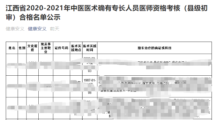 南昌市安義縣2020-2021年中醫(yī)醫(yī)術(shù)確有專長(zhǎng)人員醫(yī)師資格考核報(bào)名審核合格名單公示,具體內(nèi)容醫(yī)學(xué)教育網(wǎng)小編搜集整理如下: