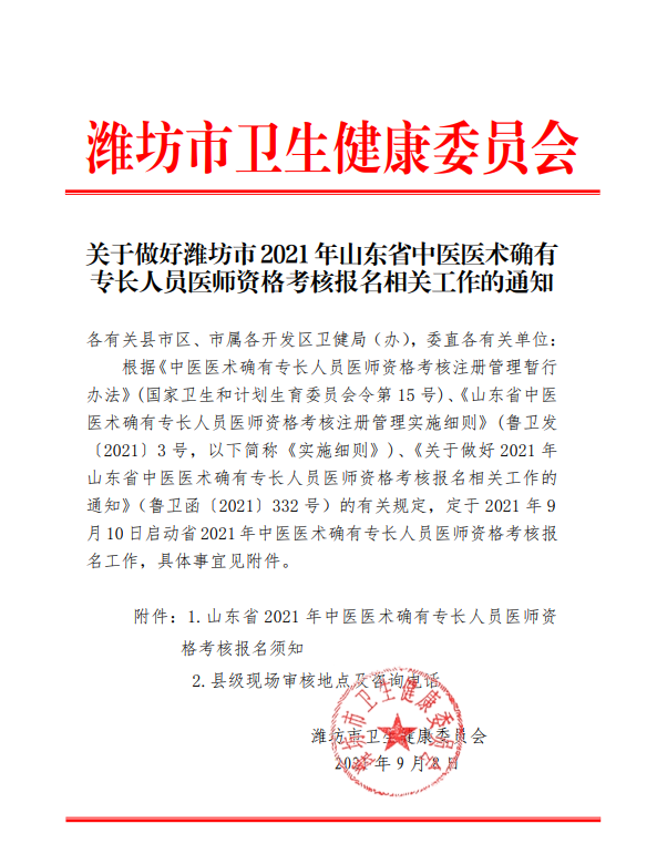 “2021年中醫(yī)醫(yī)術(shù)確有專長人員醫(yī)師資格考核濰坊市報(bào)名工作的通知”的內(nèi)容很多人都想知道,醫(yī)學(xué)教育網(wǎng)小編為此整理了“2021年中醫(yī)醫(yī)術(shù)確有專長人員醫(yī)師資格考核濰坊市報(bào)名工作的通知”,詳情如下: