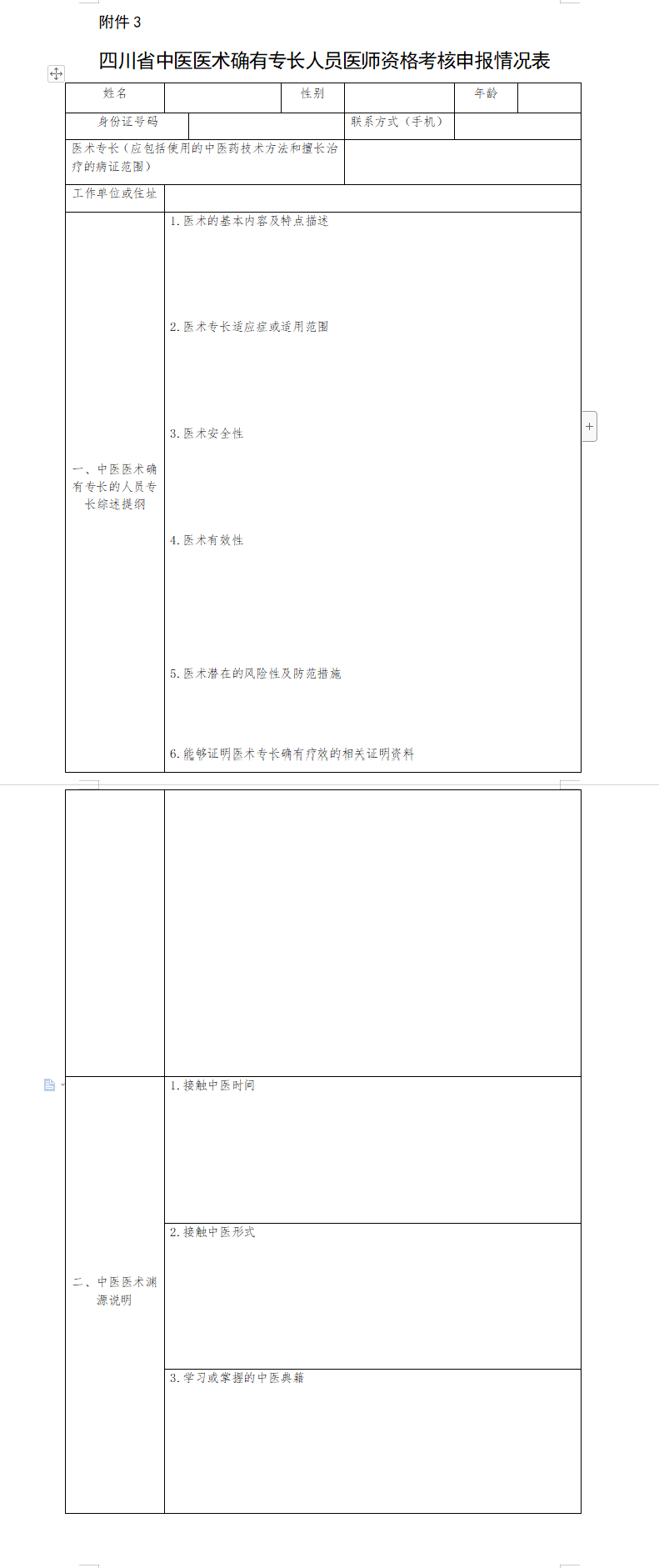 附件下載: 《四川省中醫(yī)醫(yī)術(shù)確有專(zhuān)長(zhǎng)人員醫(yī)師資格考核申報(bào)情況表》