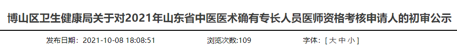 根據(jù)《山東省2021年中醫(yī)醫(yī)術確有專長人員醫(yī)師資格考核報名須知》規(guī)定,現(xiàn)將博山區(qū)2021年中醫(yī)醫(yī)術確有專長人員醫(yī)師資格考核區(qū)級初審合格人員名單予以公示。公示期為5個工作日,自2021年10月8日至2021年10月13日。