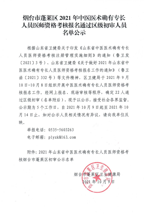 煙臺市蓬萊區(qū)發(fā)布了2021年中醫(yī)醫(yī)術(shù)確有專長人員醫(yī)師資格考核報名通過初審人員,具體通知內(nèi)容醫(yī)學(xué)教育網(wǎng)小編搜集整理如下: