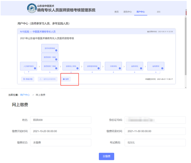 5.登錄考核服務平臺,確認省級審核通過后點擊繳費按鈕進入繳費界面;