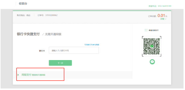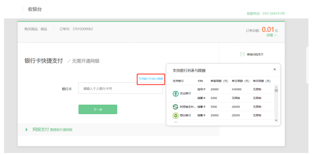 銀行卡快捷支付(無需開通網(wǎng)銀)方式:使用收銀臺-》“可用銀行列表與限額”中列出的銀行卡進行支付。