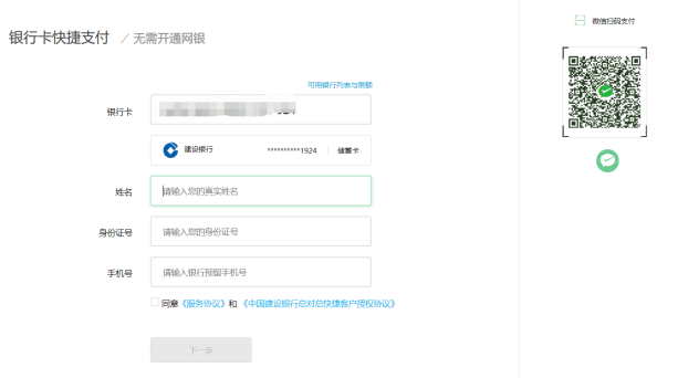 輸入個人銀行卡號,根據(jù)系統(tǒng)提示填寫個人銀行卡信息,勾選“同意《服務協(xié)議》和《中國建設銀行總對總快捷客戶授權協(xié)議》”,點擊“下一步”根據(jù)系統(tǒng)提示進行支付。