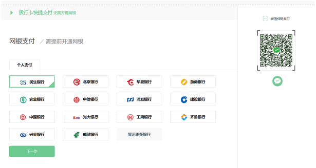 網(wǎng)銀支付(需提前開通網(wǎng)銀):點擊“網(wǎng)銀支付”,選擇用于支付的銀行圖標,點擊“下一步”跳轉到對應的網(wǎng)銀頁面,請根據(jù)系統(tǒng)提示進行支付。