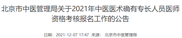 北京市發(fā)布了2021年中醫(yī)醫(yī)術(shù)確有專長(zhǎng)人員醫(yī)師資格考核報(bào)名的通知,報(bào)名人員須于12月15日9:00至12月25日17:00間,登陸北京市中醫(yī)醫(yī)術(shù)確有專長(zhǎng)人員醫(yī)師資格考核信息網(wǎng)絡(luò)平臺(tái)( http://211.152.43.98:8107 )進(jìn)行線上報(bào)名,具體通知內(nèi)容醫(yī)學(xué)教育網(wǎng)小編搜集整理如下: