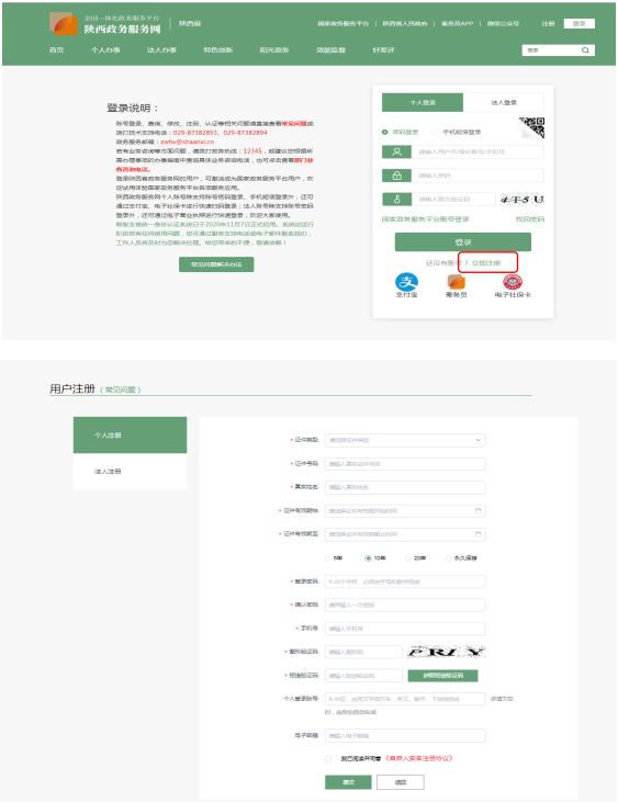 3.點(diǎn)擊“考試報(bào)名系統(tǒng)”后,系統(tǒng)自動(dòng)跳轉(zhuǎn)至“陜西政務(wù)服務(wù)網(wǎng)”,點(diǎn)擊“立即注冊(cè)”,完成“個(gè)人注冊(cè)”后提交。