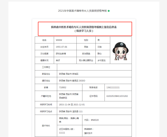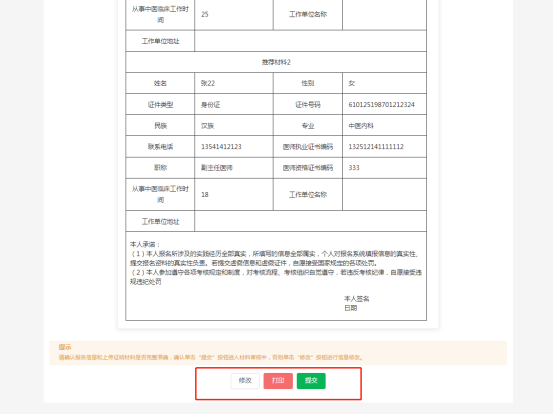 7.信息填報(bào)完成后,系統(tǒng)自動(dòng)生成《陜西省中醫(yī)醫(yī)術(shù)確有專長(zhǎng)人員醫(yī)師資格考核網(wǎng)上報(bào)名信息陜西表》??忌鷦?wù)必真實(shí)、準(zhǔn)確填報(bào)相關(guān)信息。如需修改信息,點(diǎn)擊“修改”按鈕;確認(rèn)信息無誤,點(diǎn)擊“提交”按鈕進(jìn)入材料審核,信息提交后不可修改。點(diǎn)擊“打印”按鈕,打印網(wǎng)上報(bào)名信息表。