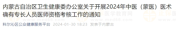根據(jù)《中醫(yī)醫(yī)術(shù)確有專長(zhǎng)人員醫(yī)師資格考核注冊(cè)管理暫行辦法》(國(guó)家衛(wèi)生和計(jì)劃生育委員會(huì)第15號(hào)令)和《內(nèi)蒙古自治區(qū)衛(wèi)生和計(jì)劃生育委員會(huì)關(guān)于印發(fā)<中醫(yī)(蒙醫(yī))醫(yī)術(shù)確有專長(zhǎng)人員醫(yī)師資格考核注冊(cè)管理暫行辦法>的通知》(內(nèi)衛(wèi)計(jì)規(guī)范〔2018〕11號(hào))有關(guān)規(guī)定,內(nèi)蒙古自治區(qū)衛(wèi)生健康委決定開(kāi)展2024年中醫(yī)(蒙醫(yī))醫(yī)術(shù)確有專長(zhǎng)人員醫(yī)師資格考核工作【以下簡(jiǎn)稱“中醫(yī)(蒙醫(yī))專長(zhǎng)醫(yī)師考核”】。現(xiàn)將有關(guān)事項(xiàng)通知如下。