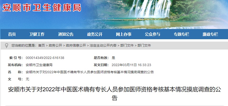 安順市2022年中醫(yī)醫(yī)術(shù)確有專長(zhǎng)人員參加醫(yī)師資格考核基本情況摸底調(diào)查的公告,醫(yī)學(xué)教育網(wǎng)編輯為您搜集整理了相關(guān)文件,請(qǐng)考生及時(shí)查看!