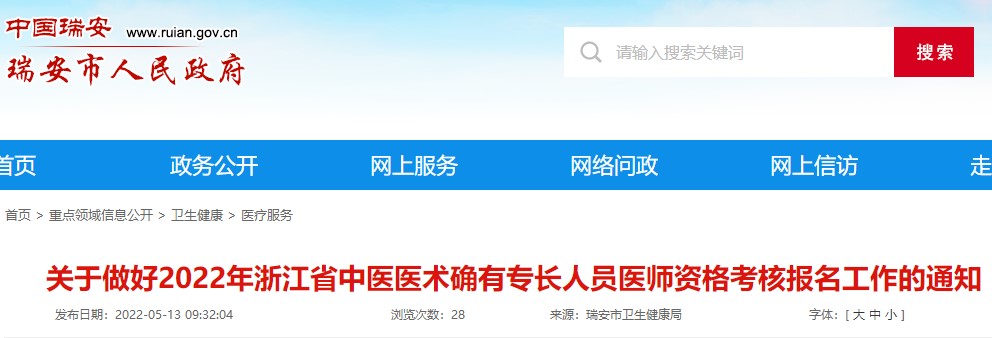 關(guān)于瑞安市做好2022年浙江省中醫(yī)醫(yī)術(shù)確有專長人員醫(yī)師資格考核報名工作的通知,醫(yī)學(xué)教育網(wǎng)編輯為您搜集整理了相關(guān)文件,請考生及時查看!