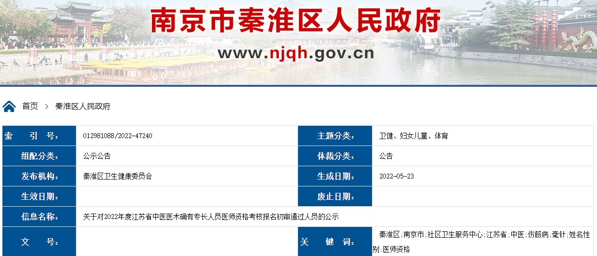 關(guān)于南京市秦淮區(qū)對(duì)2022年度江蘇省中醫(yī)醫(yī)術(shù)確有專長人員醫(yī)師資格考核報(bào)名初審?fù)ㄟ^人員的公示,醫(yī)學(xué)教育網(wǎng)編輯為您搜集整理了相關(guān)文件,請(qǐng)考生及時(shí)查看!