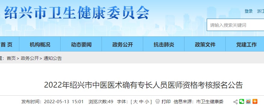 根據(jù)國家中醫(yī)藥管理局有關(guān)工作要求和《浙江省衛(wèi)生計生委關(guān)于印發(fā)浙江省中醫(yī)醫(yī)術(shù)確有專長人員醫(yī)師資格考核注冊管理實施細(xì)則的通知》(浙衛(wèi)發(fā)〔2018〕34號)《浙江省衛(wèi)生健康委員會關(guān)于修改<浙江省中醫(yī)醫(yī)術(shù)確有專長人員醫(yī)師資格考核注冊管理實施細(xì)則>的決定》(浙衛(wèi)發(fā)〔2019〕39號)有關(guān)規(guī)定,現(xiàn)將2022年紹興市中醫(yī)醫(yī)術(shù)確有專長人員醫(yī)師資格考核報名工作有關(guān)事項公告如下: