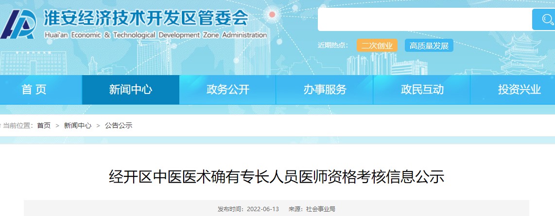 江蘇省淮安市經(jīng)開(kāi)區(qū)2022年中醫(yī)醫(yī)術(shù)確有專長(zhǎng)人員醫(yī)師資格考核信息公示