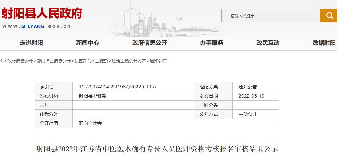 射陽(yáng)縣2022年江蘇省中醫(yī)醫(yī)術(shù)確有專長(zhǎng)人員醫(yī)師資格考核報(bào)名審核結(jié)果公示