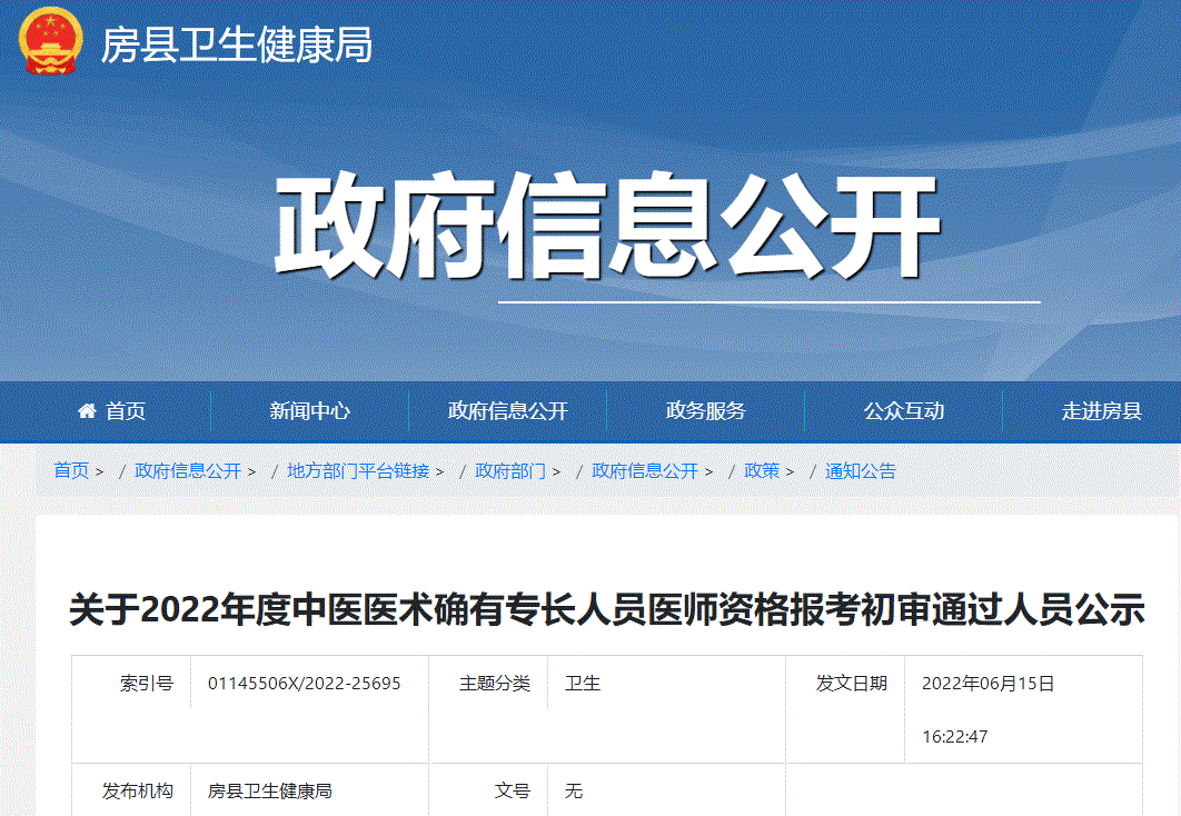 根據(jù)《中醫(yī)醫(yī)術(shù)確有專長人員醫(yī)師資格考核注冊管理暫行辦法(國家衛(wèi)生計(jì)生委令第15號)》《湖北省中醫(yī)醫(yī)術(shù)確有專長人員醫(yī)師資格考核注冊管理實(shí)施細(xì)則(試行)》(鄂衛(wèi)生計(jì)生規(guī)〔2018〕3號)及《省衛(wèi)生健康委關(guān)于開展2022年中醫(yī)醫(yī)術(shù)確有專長人員醫(yī)師資格考核工作的通知》文件要求,對我縣23名報(bào)考初審?fù)ㄟ^人員(名單附后)進(jìn)行公示,公示時(shí)間為2022年6月16日至6月20日(5個(gè)工作日)。如有疑議請?jiān)诠酒趦?nèi)實(shí)名通過書面材料或電話、電子郵件形式向我局反映。以個(gè)人名義反映的請?zhí)峁┱鎸?shí)姓名、詳細(xì)聯(lián)系地址和聯(lián)系電話;以單位名義反映的請加蓋本單位公章。反映情況和問題,要堅(jiān)持實(shí)事求是、合理合法的原則,不得借機(jī)誹謗和誣告。