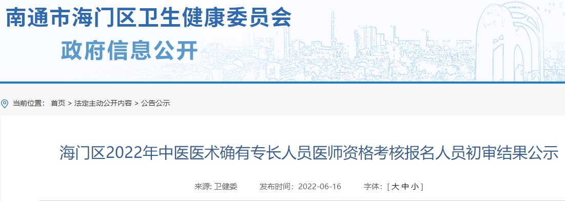 南通市海門(mén)區(qū)2022年中醫(yī)醫(yī)術(shù)確有專(zhuān)長(zhǎng)人員醫(yī)師資格考核報(bào)名人員初審結(jié)果公示,醫(yī)學(xué)教育網(wǎng)編輯為您搜集整理了相關(guān)文件,請(qǐng)考生及時(shí)查看!