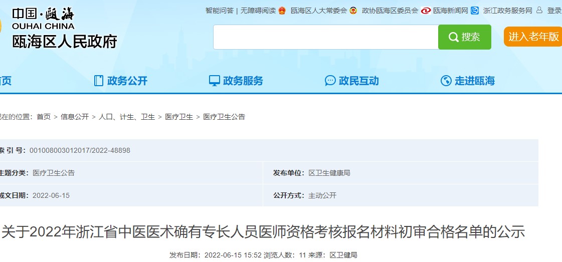 甌海區(qū)關(guān)于2022年浙江省中醫(yī)醫(yī)術(shù)確有專長人員醫(yī)師資格考核報名材料初審合格名單的公示,醫(yī)學教育網(wǎng)編輯為您搜集整理了相關(guān)文件,請考生及時查看!