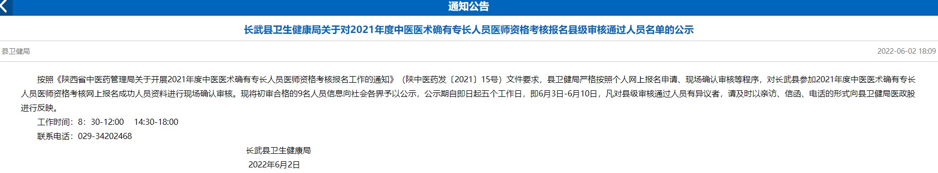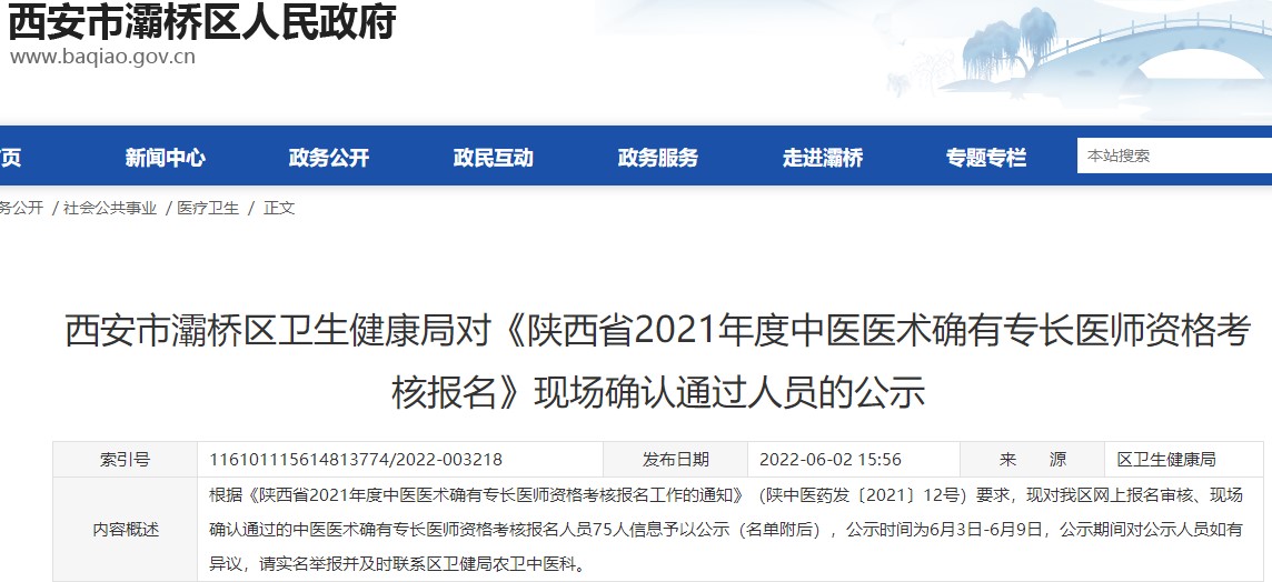 按照《陜西省中醫(yī)藥管理局關(guān)于開展2021年度中醫(yī)醫(yī)術(shù)確有專長(zhǎng)人員醫(yī)師資格考核報(bào)名工作的通知》(陜中醫(yī)藥發(fā)〔2021〕15號(hào))文件要求,縣衛(wèi)健局嚴(yán)格按照個(gè)人網(wǎng)上報(bào)名申請(qǐng)、現(xiàn)場(chǎng)確認(rèn)審核等程序,對(duì)長(zhǎng)武縣參加2021年度中醫(yī)醫(yī)術(shù)確有專長(zhǎng)人員醫(yī)師資格考核網(wǎng)上報(bào)名成功人員資料進(jìn)行現(xiàn)場(chǎng)確認(rèn)審核?,F(xiàn)將初審合格的9名人員信息向社會(huì)各界予以公示,公示期自即日起五個(gè)工作日,即6月3日-6月10日,凡對(duì)縣級(jí)審核通過人員有異議者,請(qǐng)及時(shí)以親訪、信函、電話的形式向縣衛(wèi)健局醫(yī)政股進(jìn)行反映。