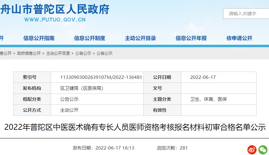 2022年普陀區(qū)中醫(yī)醫(yī)術(shù)確有專長人員 醫(yī)師資格考核報(bào)名材料初審合格名單公示