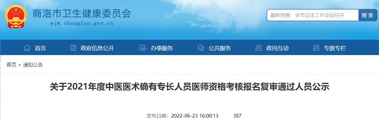 為貫徹落實《中華人民共和國中醫(yī)藥法》,根據(jù)《中醫(yī)醫(yī)術確有專長人員醫(yī)師資格考核注冊管理暫行辦法》(國家衛(wèi)生計生委令第15號)、《陜西省中醫(yī)醫(yī)術確有專長人員醫(yī)師資格考核報名暫行規(guī)定(修訂版)》(陜中醫(yī)藥發(fā)〔2021〕12號)的有關規(guī)定,經(jīng)商洛市衛(wèi)生健康委員會中醫(yī)醫(yī)術確有專長人員醫(yī)師資格考核報名復審專家組復核,現(xiàn)對127名地市審核通過人員進行公示,公示期限:自公示發(fā)布之日起5個工作日。公示期內,凡對上述人員有異議或者申請人對復審結果有疑問需申請復核的,請在公示期內以信函形式實名向商洛市衛(wèi)生健康委員會中醫(yī)藥管理科(信函以到達日郵戳為準)反映,并署明聯(lián)系人及聯(lián)系方式,否則不予受理。申請結果復核結論由中醫(yī)藥主管部門逐級通知申請者本人。