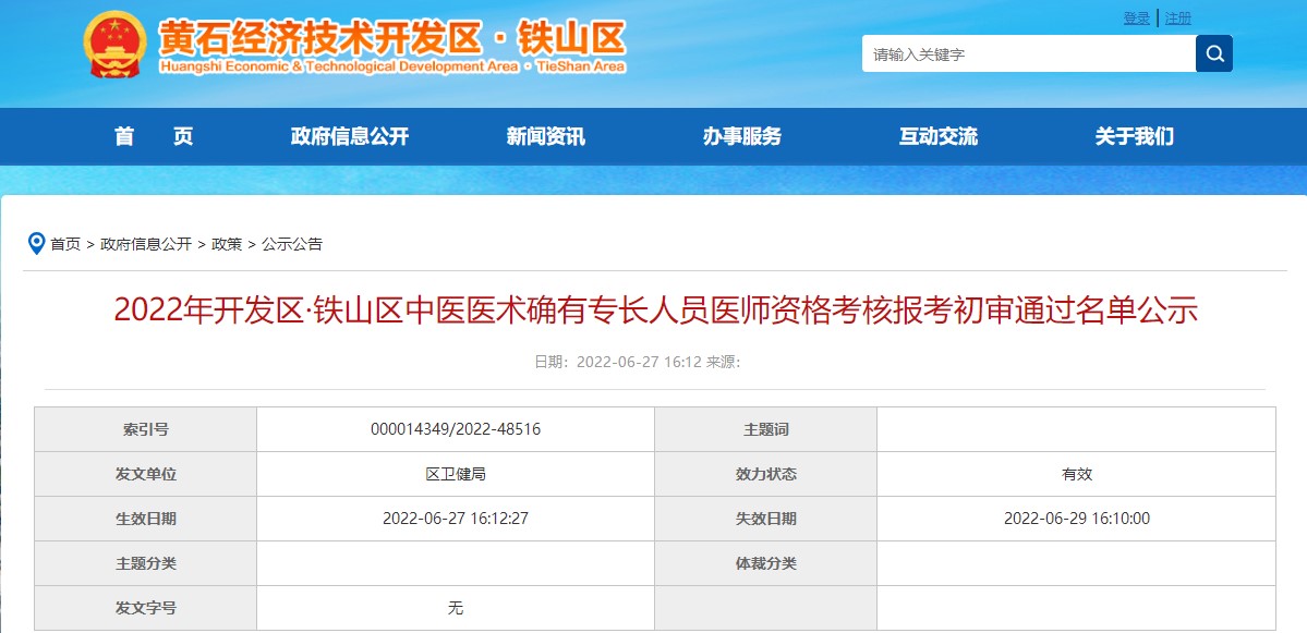 根據(jù)省衛(wèi)生健康委印發(fā)的《關于開展2022年中醫(yī)醫(yī)術確有專長人員醫(yī)師資格考核工作的通知》(鄂衛(wèi)函〔2022〕67號)文件要求,經我局審核,開發(fā)區(qū)·鐵山區(qū)符合報考2022年中醫(yī)醫(yī)術確有專長人員醫(yī)師資格考核條件的有7人。現(xiàn)將相關報考人員信息予以公示。