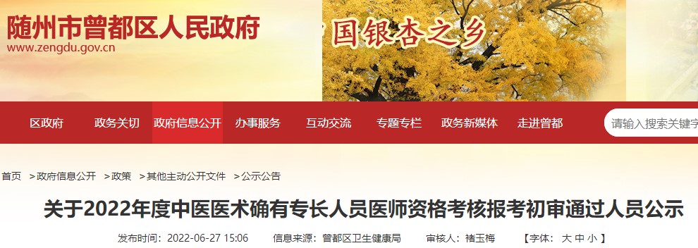 醫(yī)學(xué)教育網(wǎng)編輯為您搜集整理了“隨州市曾都區(qū)關(guān)于2022年度中醫(yī)醫(yī)術(shù)確有專長人員醫(yī)師資格考核報考初審?fù)ㄟ^人員公示”的相關(guān)信息,具體內(nèi)容如下,請考生及時查看!
