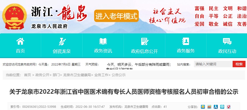 根據(jù)《浙江省中醫(yī)藥管理局關(guān)于做好2022年浙江省中醫(yī)醫(yī)術(shù)確有專長人員醫(yī)師資格考核報名工作的通知》的文件精神,在自愿報名的基礎(chǔ)上,經(jīng)過我局初審,共有6名報考人員初審合格(具體詳見附件),現(xiàn)予以公示,公示時間:2022年6月30日——2022年7月6日,公示期間,任何單位和個人均可通過來信、來電、來訪的形式,向龍泉市衛(wèi)生健康局醫(yī)政醫(yī)管與藥物政策科(中醫(yī)藥管理科)反映問題,信函以寄件日郵戳為準(zhǔn),要求反映問題必須客觀公正、實事求是。以單位名義反映問題的應(yīng)加蓋單位公章,以個人名義反映問題的應(yīng)署名本人真實姓名,并提供真實聯(lián)系電話,非實名和非真實聯(lián)系方式的不接收。