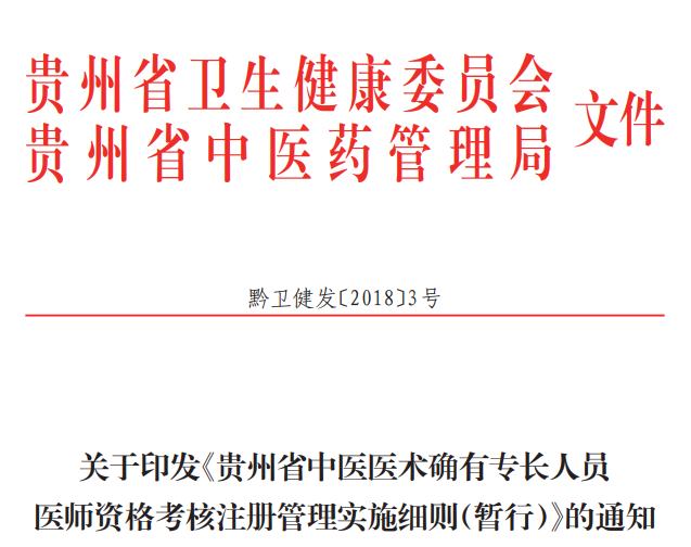 貴州省中醫(yī)醫(yī)術(shù)確有專(zhuān)長(zhǎng)人員醫(yī)師資格考核注冊(cè)管理實(shí)施細(xì)則黔衛(wèi)健發(fā)〔2018〕3號(hào)