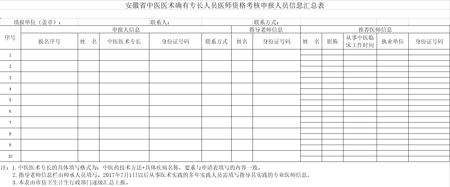 附件下載:安徽省中醫(yī)醫(yī)術(shù)確有專長人員醫(yī)師資格考核申報(bào)人員信息匯總表
