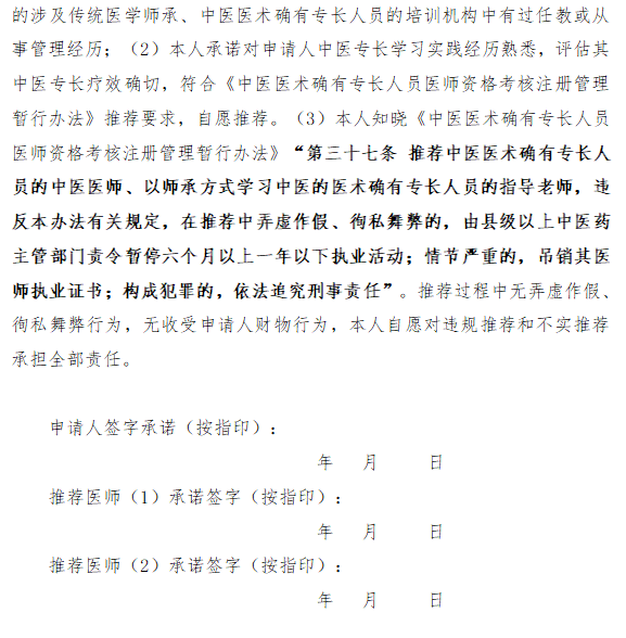 3. 推薦醫(yī)師(1) (按指?。?) (按指?。┏兄Z:(1)本人符合國家和我省規(guī)定的推薦醫(yī)師條件,沒有受過黨政紀處分,近5年內(nèi)發(fā)生過負主要責(zé)任的二級及二級以上醫(yī)療事故,沒有在社會舉辦的涉及傳統(tǒng)醫(yī)學(xué)師承、中醫(yī)醫(yī)術(shù)確有專長人員的培訓(xùn)機構(gòu)中有過任教或從事管理經(jīng)歷;(2)本人承諾對申請人中醫(yī)專長學(xué)習(xí)實踐經(jīng)歷熟悉,評估其中醫(yī)專長療效確切,符合《中醫(yī)醫(yī)術(shù)確有專長人員醫(yī)師資格考核注冊管理暫行辦法》推薦要求,自愿推薦。(3)本人知曉《中醫(yī)醫(yī)術(shù)確有專長人員醫(yī)師資格考核注冊管理暫行辦法》“第三十七條 推薦中醫(yī)醫(yī)術(shù)確有專長人員的中醫(yī)醫(yī)師、以師承方式學(xué)習(xí)中醫(yī)的醫(yī)術(shù)確有專長人員的指導(dǎo)老師,違反本辦法有關(guān)規(guī)定,在推薦中弄虛作假、徇私舞弊的,由縣級以上中醫(yī)藥主管部門責(zé)令暫停六個月以上一年以下執(zhí)業(yè)活動;情節(jié)嚴重的,吊銷其醫(yī)師執(zhí)業(yè)證書;構(gòu)成犯罪的,依法追究刑事責(zé)任”。推薦過程中無弄虛作假、徇私舞弊行為,無收受申請人財物行為,本人自愿對違規(guī)推薦和不實推薦承擔(dān)全部責(zé)任。