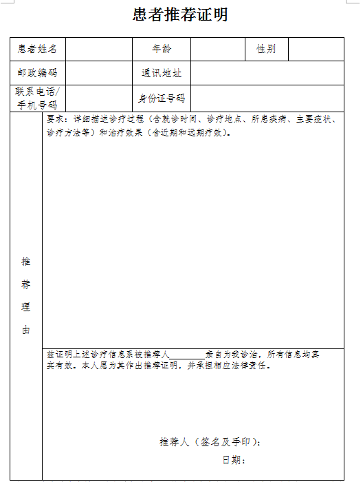 注:1.患者診療資料以附件形式附后;2.推薦的患者須提供本市常住的身份證明(身份證、居住證等),復印件附后;3.兒科患者等特殊推薦人如無完全民事行為能力的 ,可以由其監(jiān)護人代為簽名及手印。