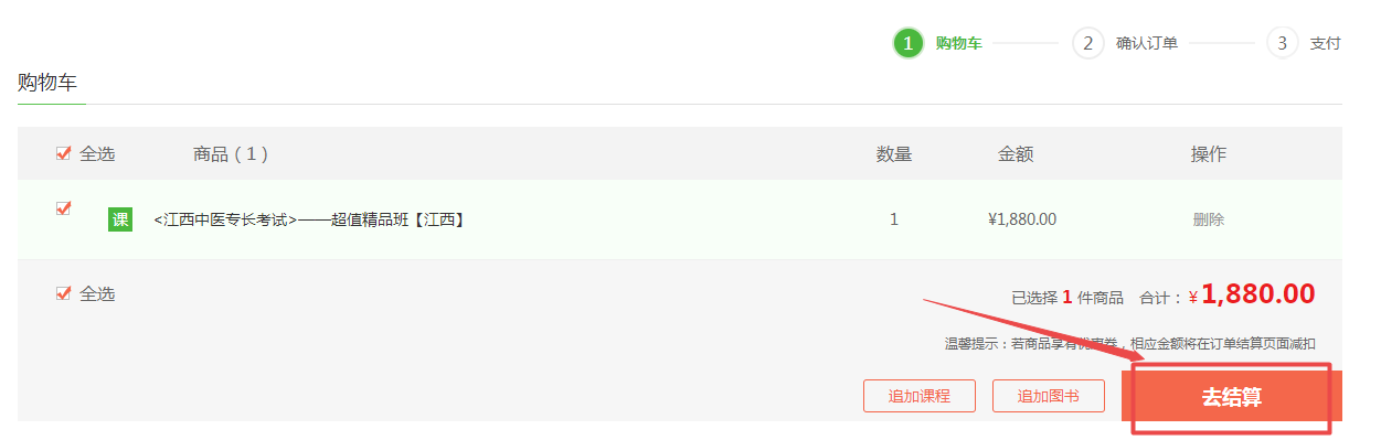 2、在購物車內(nèi)確認(rèn)已選課程,確認(rèn)無誤后點(diǎn)擊“去結(jié)算”;