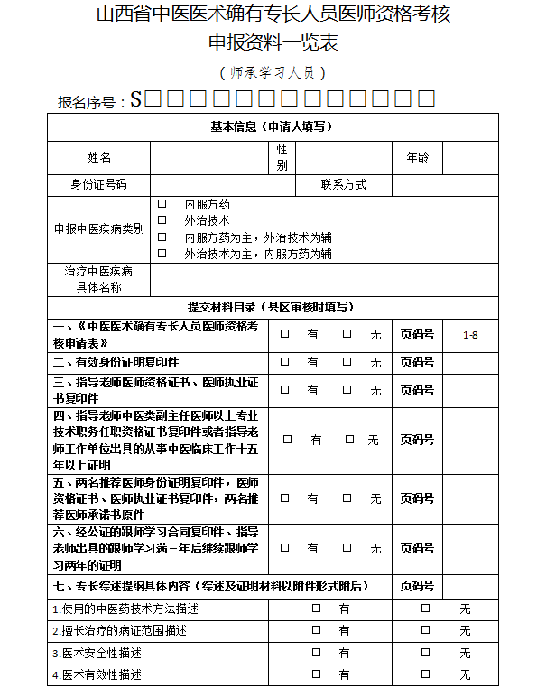 關(guān)于“山西省中醫(yī)專長考核申報(bào)資料一覽表(師承學(xué)習(xí)人員)模板”相關(guān)內(nèi)容,相信參加中醫(yī)醫(yī)術(shù)確有專長人員醫(yī)師資格考核的考生都想知道,為方便大家了解,在此醫(yī)學(xué)教育網(wǎng)小編為大家整理如下內(nèi)容: