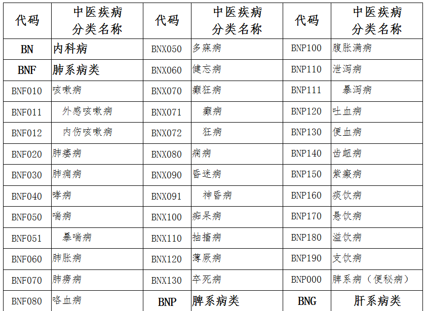 中醫(yī)疾病名稱與分類代碼表部分截圖