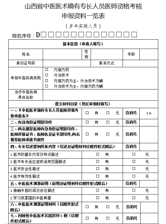 關(guān)于“多年實踐人員報考山西省中醫(yī)專長考核申報資料一覽表”相關(guān)內(nèi)容,相信參加中醫(yī)醫(yī)術(shù)確有專長人員醫(yī)師資格考核的考生都想知道,為方便大家了解,在此醫(yī)學(xué)教育網(wǎng)小編為大家整理如下內(nèi)容:
