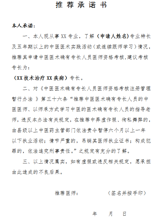 關(guān)于“中醫(yī)醫(yī)術(shù)確有專長(zhǎng)考核:推薦承諾書模板(附下載)”相關(guān)內(nèi)容,相信參加中醫(yī)醫(yī)術(shù)確有專長(zhǎng)人員醫(yī)師資格考核的考生都想知道,為方便大家了解,在此醫(yī)學(xué)教育網(wǎng)小編為大家整理如下內(nèi)容: