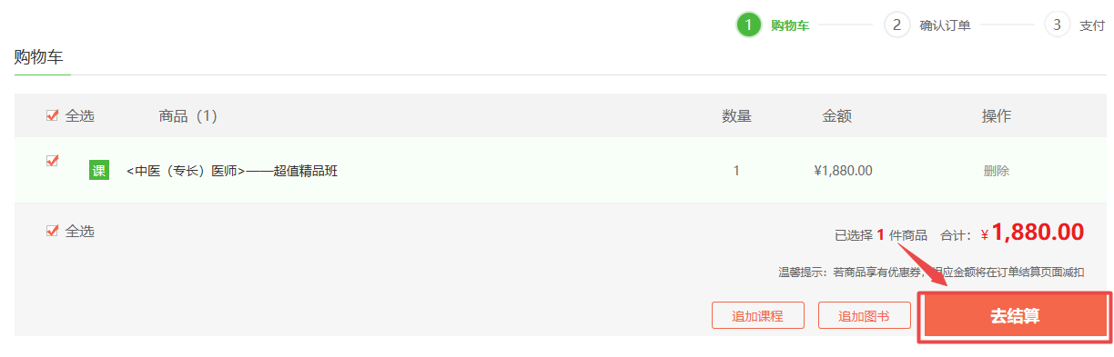 2、在購(gòu)物車內(nèi)確認(rèn)已選課程,確認(rèn)無(wú)誤后點(diǎn)擊“去結(jié)算”;