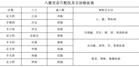 1.分布特點和組成:八脈交會穴均分布于肘膝以下,包括公孫、內(nèi)關(guān)、后溪、申脈、足臨泣、外關(guān)、列缺、照海。