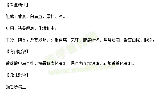 關于“中醫(yī)醫(yī)術確有專長考點:香薷散方歌口訣(祛暑劑)”相關內容,相信參加中醫(yī)醫(yī)術確有專長考核的考生都在關注,為幫助大家了解,在此醫(yī)學教育網小編為大家整理如下內容: