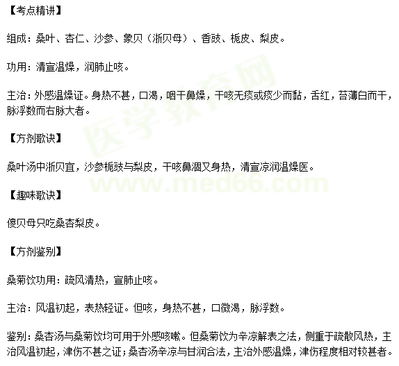 關(guān)于“中醫(yī)醫(yī)術(shù)確有專長方劑歌訣考點:桑杏湯的功效與作用”相關(guān)內(nèi)容,相信參加中醫(yī)醫(yī)術(shù)確有專長人員醫(yī)師資格考核的考生都在學(xué)習(xí),為幫助大家備考,醫(yī)學(xué)教育網(wǎng)小編為大家整理如下內(nèi)容: