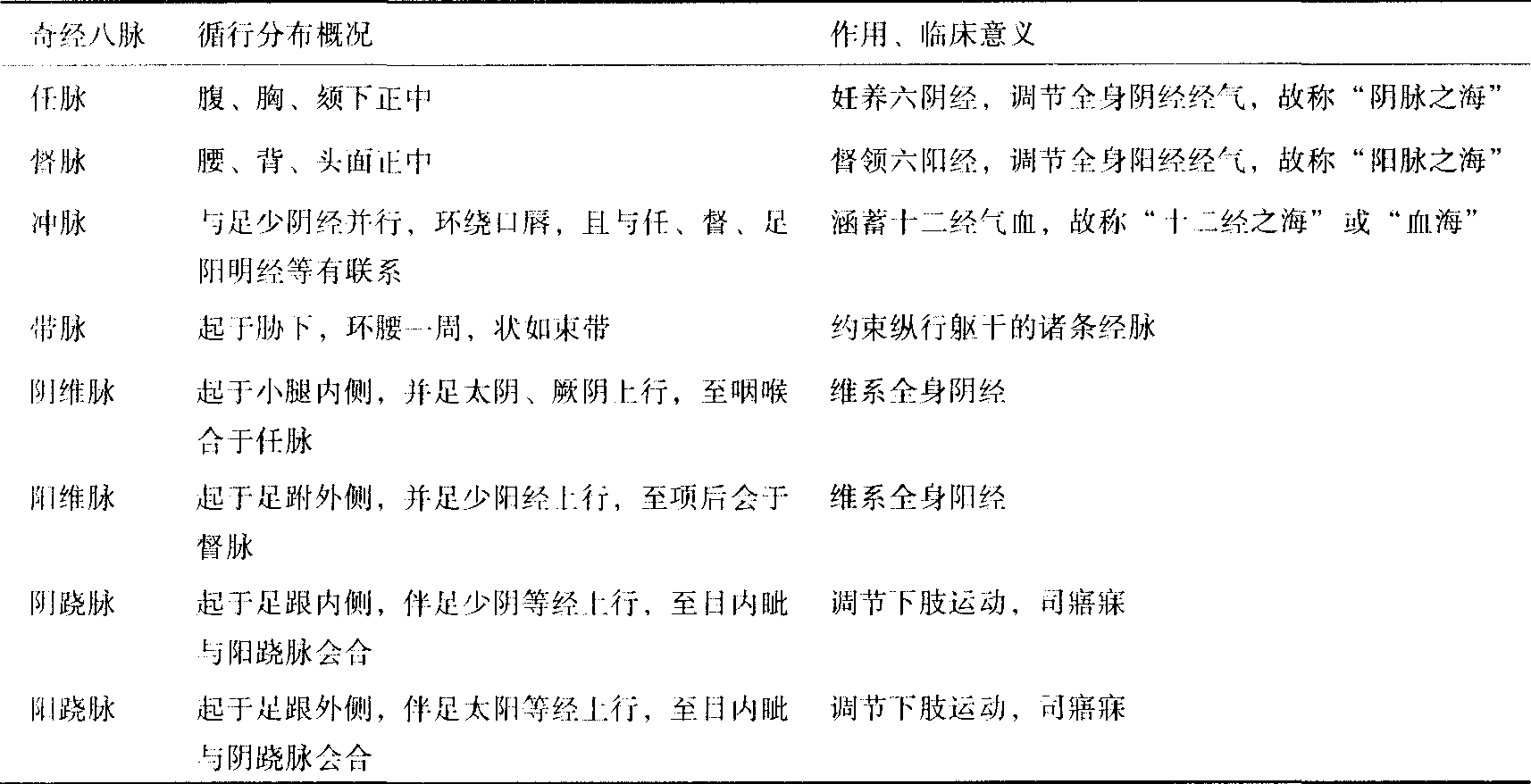 奇經(jīng)八脈大體的循行分布和作用、臨床意義見下表。