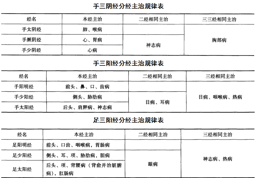 分經(jīng)主治規(guī)律即某一經(jīng)脈所屬的經(jīng)穴均可治療該經(jīng)循行部位及其相應(yīng)臟腑的病證。同一經(jīng)脈的不同經(jīng)穴,可以治療本經(jīng)相同的病證。如手太陰經(jīng)腧穴主治肺、喉病證,手陽(yáng)明經(jīng)腧穴主治頭面病證等。根據(jù)腧穴的分經(jīng)主治規(guī)律,后世醫(yī)家在針灸治療上有“寧失其穴,勿失其經(jīng)”之說(shuō)。