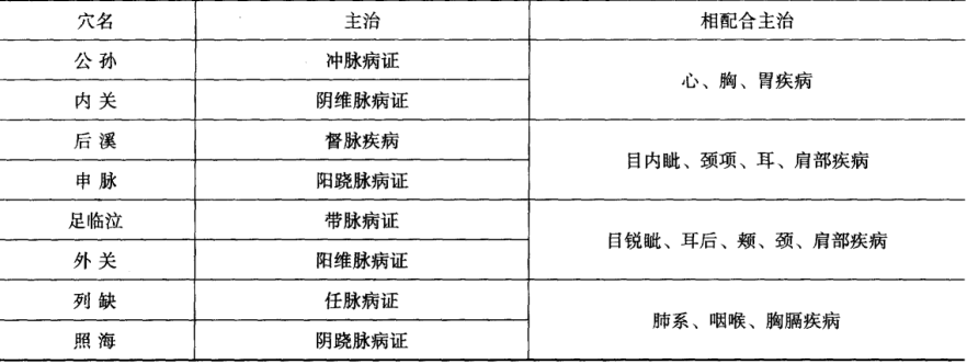 現(xiàn)將八脈交會穴配伍及主治病證列表如下: