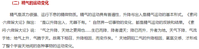 精氣學(xué)說認(rèn)為萬物的本源是精氣,人類作為宇宙萬物之一,亦由精氣所構(gòu)成,生命過程就是精氣的運(yùn)動(dòng)過程。新生命的產(chǎn)生,乃是由于精氣凝聚而成,同時(shí),精氣亦維持著生命活動(dòng)的全過程,故精氣一旦離散,則生命活動(dòng)亦隨之終止,人之生命始于精氣之聚合,而終于精氣之散失,說明了生命過程的物質(zhì)性。
