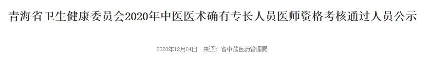 青海省發(fā)布了2020年度中醫(yī)醫(yī)術(shù)確有專長人員醫(yī)師資格考核通過人員公示的通知,根據(jù)《青海省中醫(yī)醫(yī)術(shù)確有專長人員醫(yī)師資格考核注冊管理實(shí)施細(xì)則(試行)》(青衛(wèi)中〔2018〕8號)和《青海省衛(wèi)生健康委關(guān)于2020年中醫(yī)醫(yī)術(shù)確有專長人員醫(yī)師資格考核報(bào)名的通知》(青衛(wèi)中〔2020〕34號)要求,我委于2020年11月27日組織開展2020年度全省中醫(yī)醫(yī)術(shù)確有專長人員醫(yī)師資格考核。經(jīng)考核專家委員會考核,復(fù)核專家委員會復(fù)核,確定陳磊等9人通過考核(名單附后),現(xiàn)予以公示。公示期間,如有異議,任何單位和個人可通過來信、來電、來訪的形式,向省中藏醫(yī)藥管理局反映。以信函反映問題的有效時間以寄件日郵戳為準(zhǔn);以單位名義反映問題的應(yīng)加蓋單位公章;以個人名義反映問題的應(yīng)署本人真實(shí)姓名,并提供聯(lián)系電話。要求反映的問題必須客觀公正、實(shí)事求是。